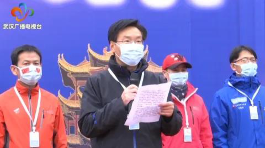 梁鸣在武汉雷神山医院首批外省医疗队集中撤离仪式上致辞 (图片来源:武汉广播电视台微信公众号)