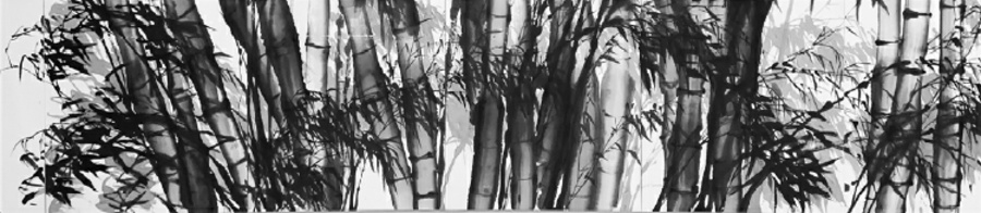 我也爱竹,并师竹、学竹、画竹、颂竹。于是,竹就成为我表达心中无限感动、无尽感慨的第一选择,也便有了这片竹林———《风雨见真情》。这幅作品,由6页6尺宣纸横拼组成,长5.2米、宽1.8米,取竹干的最坚韧部分,结实有力,竿形尤其粗大、挺拔,上顶“天”,下立“地”;竹干之间密而不挤,互相依傍,虚实相生,每每交叉斜贯,力到意到,富有苍劲之感。竹子有粗有细,有新篁,有老干,笔笔交代清楚;主干和小枝前后交错,互相呼应,刚柔相济。强健的枝干似有风吹过,萧萧飒飒,如疾风振林,凸显一种勃发的生命力。逢风遇雪,不蔓不枝,依然向上延伸,风雨中可见真情。