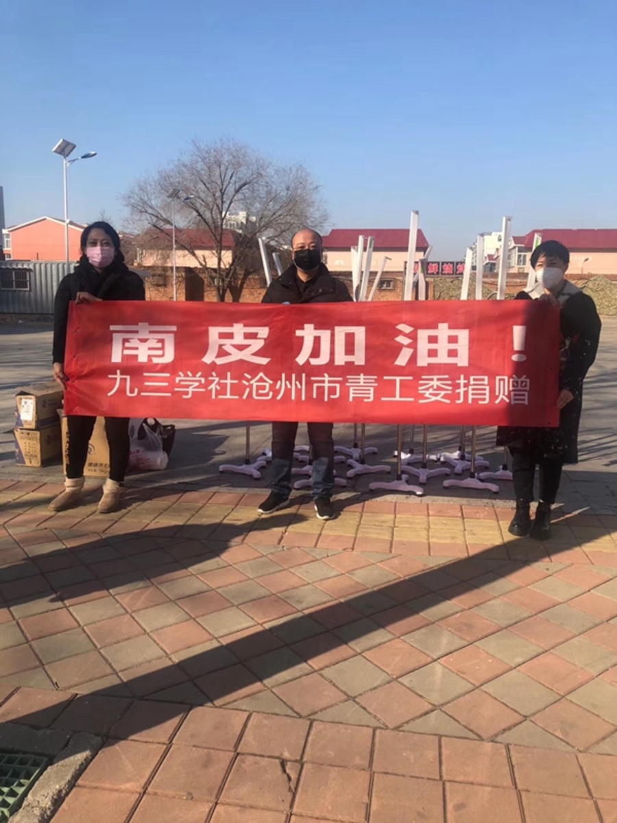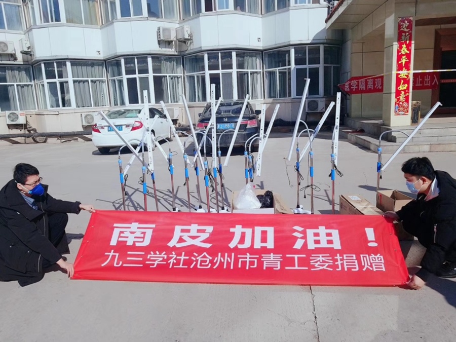 九三学社沧州市青工委认真落实社市委要求,在得知沧州市疫情较为严重的南皮县,缺少紫外线消毒仪、防护服、口罩等医疗物资时,自发开展了捐助活动。青年社员纷纷解囊,并利用多种渠道寻求医疗物资。在大家的共同努力下,2月18 日上午,一辆满载着九三学社沧州市青工委捐赠物资的中巴车抵达南皮县宾馆医疗隔离点。此次活动,九三学社沧州市青工委共捐赠防护服45套,手套100副,医用口罩610个,紫外线消毒仪16台,护目镜200副,助力南皮打赢疫情防控阻击战。(岳建玲)