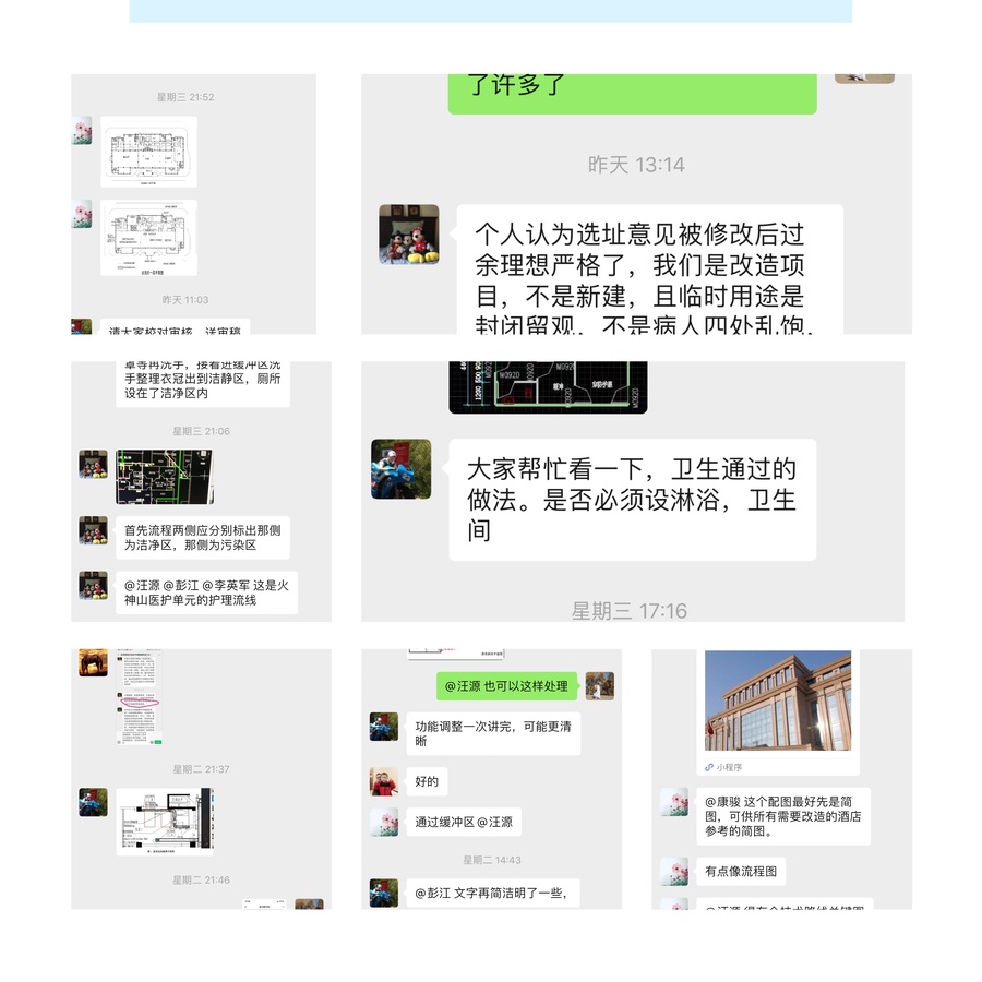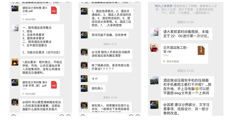 项目组于2月2日晚紧急成立,汪源副主委对成员进行分工,强调了时间的紧迫性与任务的重要性。大家昼夜赶工,针对宾馆的选择、建筑功能的调整和优化、外部交通的组织、内部流线的安排、后勤保障安排、通风系统的修改、污水的临时处理、电力保障等,秉承高效、经济、安全的原则进行图纸设计、案例改造,不仅多次召开网上视频会议对方案进行反复讨论与修改,还与疫情一线医生联系沟通,准确把握隔离病房的要求。经过五天五夜的努力,《新型冠状病毒感染肺病疑似患者集中隔离场所临时改造设计导则(宾馆类)》迅速出台。