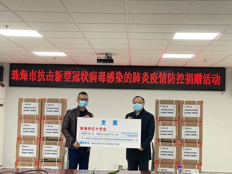 目前,新型冠状病毒感染的肺炎疫情正处于防控关键期,珠海市高新区的一线工作人员连日来履职尽责、凝心聚力,站在防控疫情的最前面。2月5日,为助力高新区打赢疫情防控战,九三学社珠海市委第五支社副主委、珠海高新区食品药械安全协会秘书长曾庆涛代表协会向珠海市红十字会捐赠了12000个医用防护口罩,供高新区奋战于疫情防控一线的工作人员使用。
