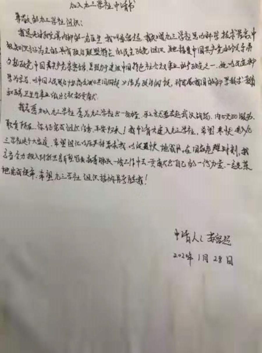 内科医生苏留超2019年5月申请加入九三学社,在考察期间,他积极参与社务工作,主动参加赴宝坻小白庄义诊活动。疫情发生后,他主动请战,于2020年1月28日随天津市第二批支援湖北医疗队驰援武汉。出发前,他再一次写下入社申请书,表达了志愿做九三人的决心。