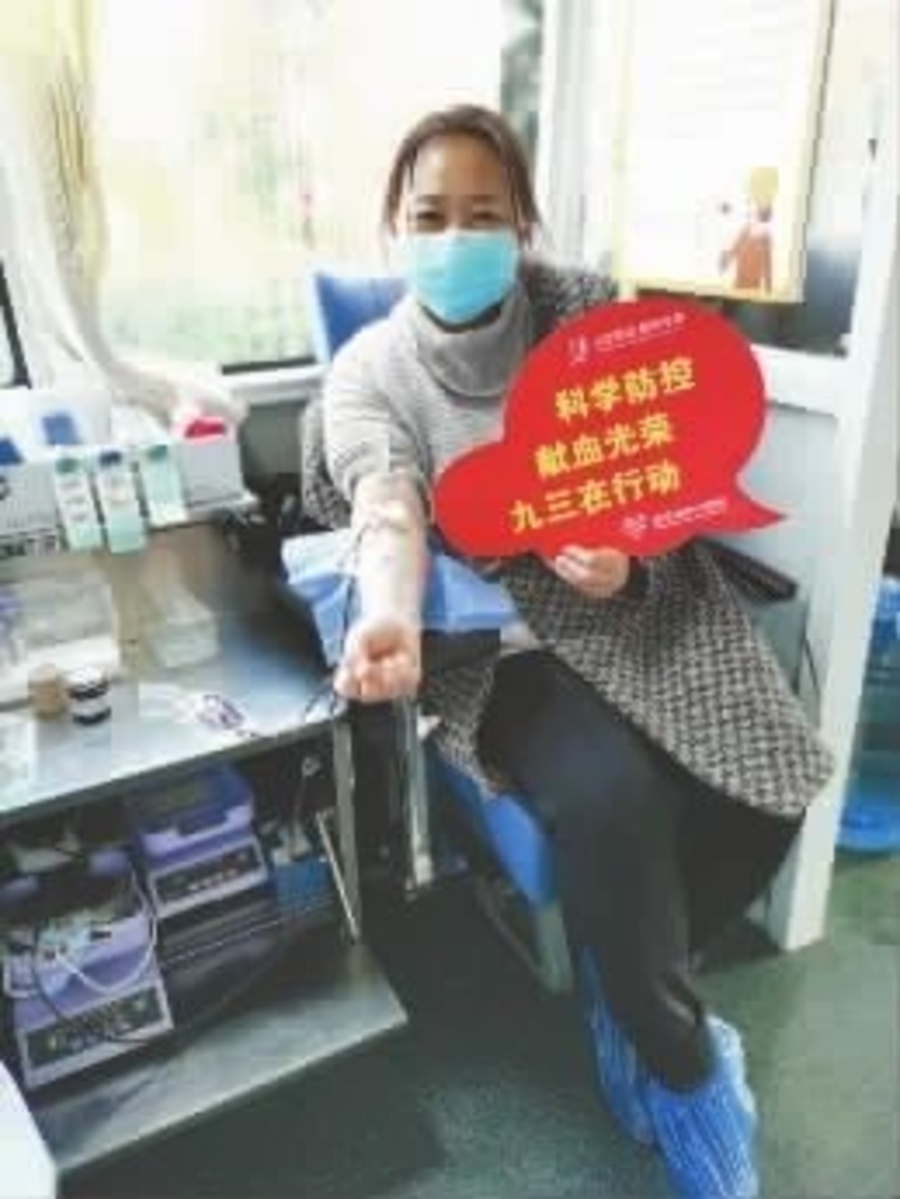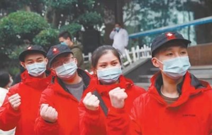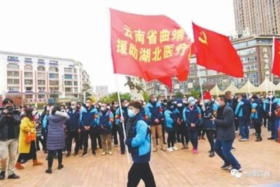邓星梅(前方执旗者),云南省曲靖市援助湖北医疗队队长、曲靖市妇幼保健院副院长、九三学社曲靖市委会副主委。