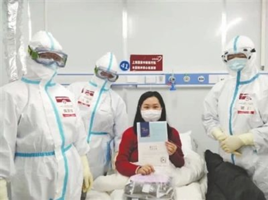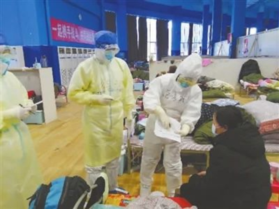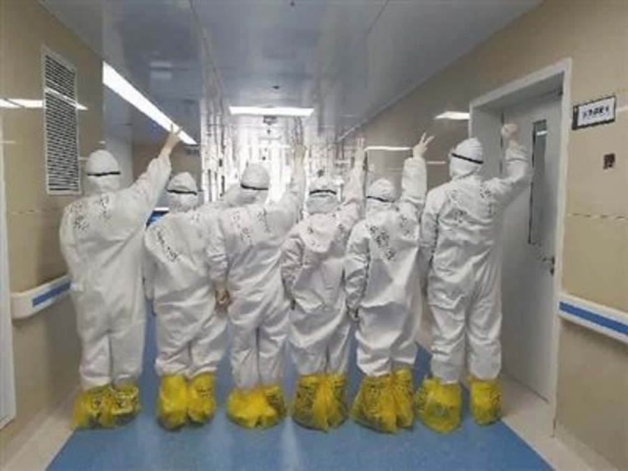 姜恺(左二),上海援鄂医疗队队员、上海中医药大学附属岳阳医院主治医师、九三学社社员。