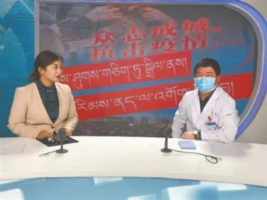 韩海林(右),青海省第五人民医院主治医师、九三学社社员。在对口支援青海省河南蒙古族自治县人民医院医疗服务工作期间,受邀参加电视台新冠肺炎防控知识讲座。