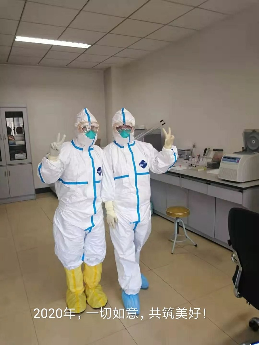 宁夏疾控中心社员吴忠兰与同事在岗位上迎接春节展示必胜的信心