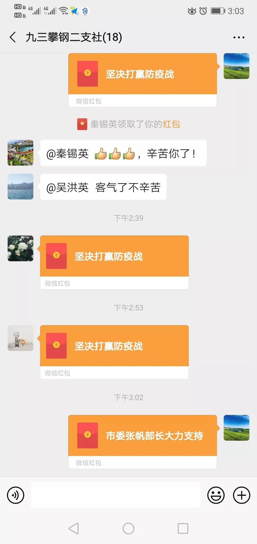 倡议书在微信群中发出后便得到了众多社员的积极响应,微信红包不停地在群中闪动,50元、100元、200元……,半天时间,34名社员共计捐款4340元。此笔捐款将用来为攀钢集团总医院密地院区发热门诊一线医务工作者的提供午餐。