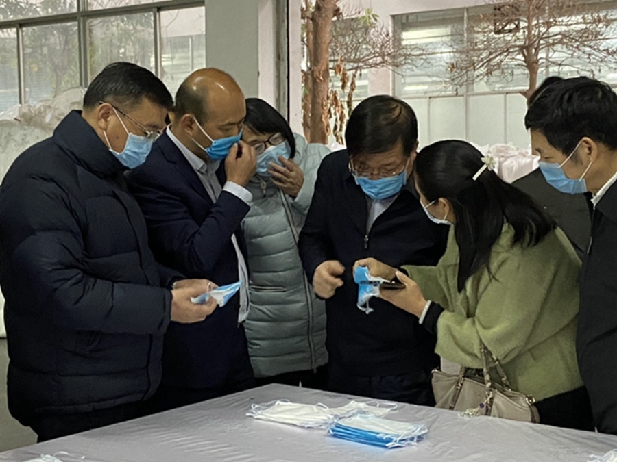 来宾市企业家社员 蓝国勇(左二)改装生产线生产民用口罩支援抗疫
