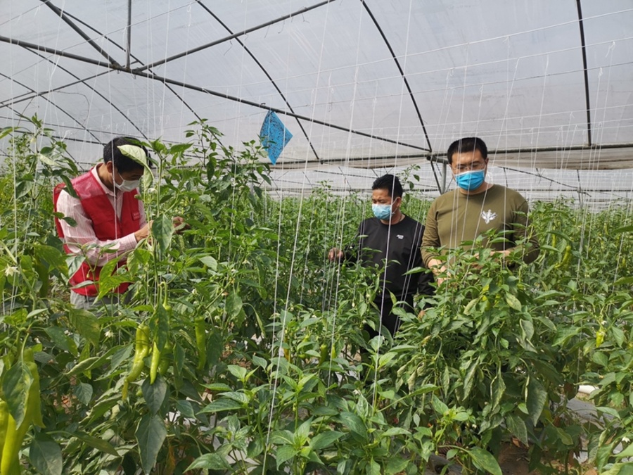 九三学社社员、广西北海市驻村扶贫工作队员潘荫华(左一)在进行大棚辣椒田间管理工作