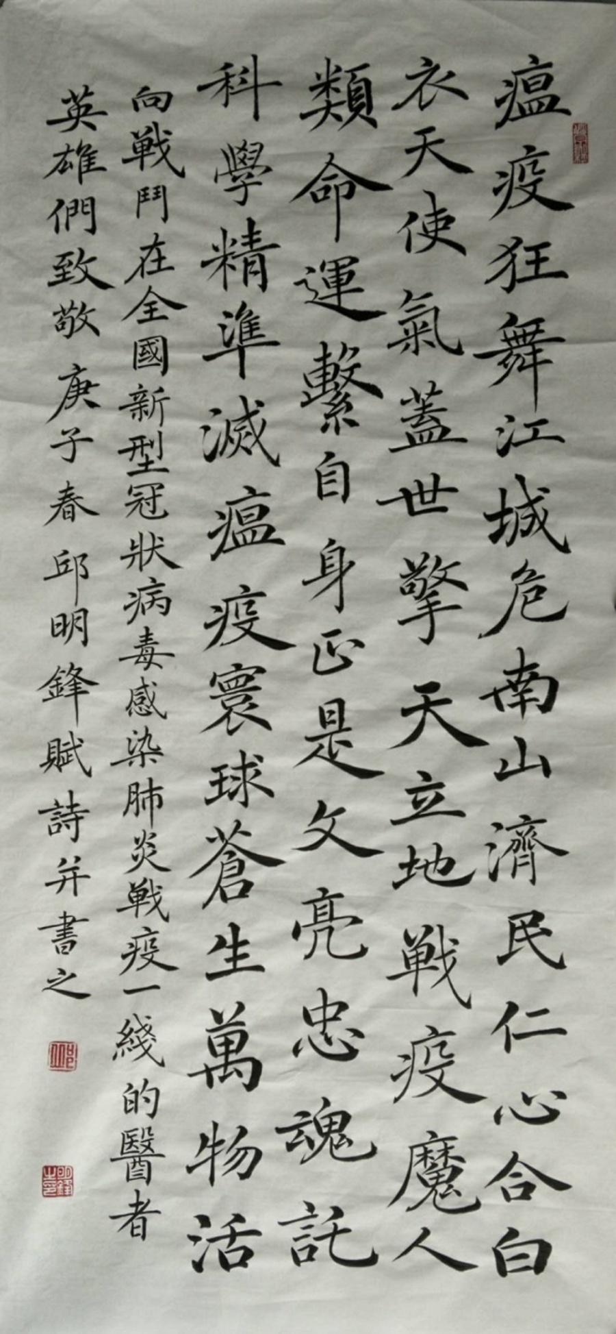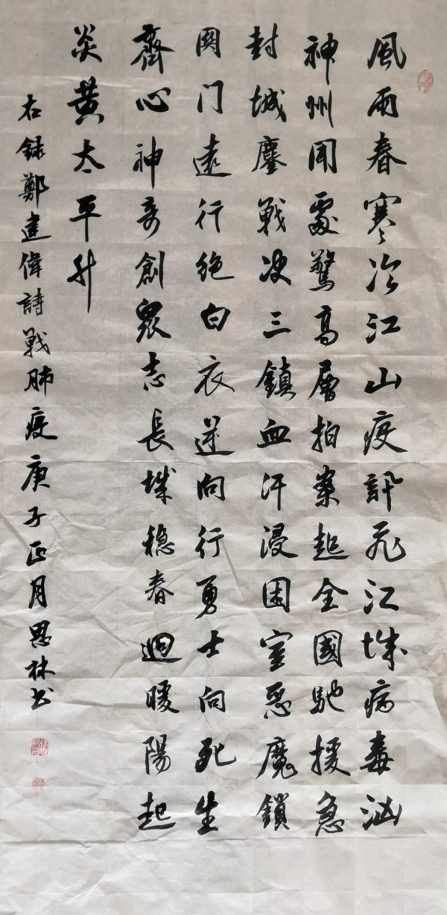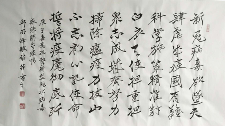 在应对新型冠状病毒肺炎疫情的战场上,内江九三人携手并肩,同心战“疫”,有的在一线救治患者、阻击疫情传播,还有的通过建言献策、创作文艺作品,九三学社内江市委的书画家们唯有以翰墨寄真情,以妙笔抒大爱, 为战“疫”呐喊助威,祈愿早日扫疫除魔。