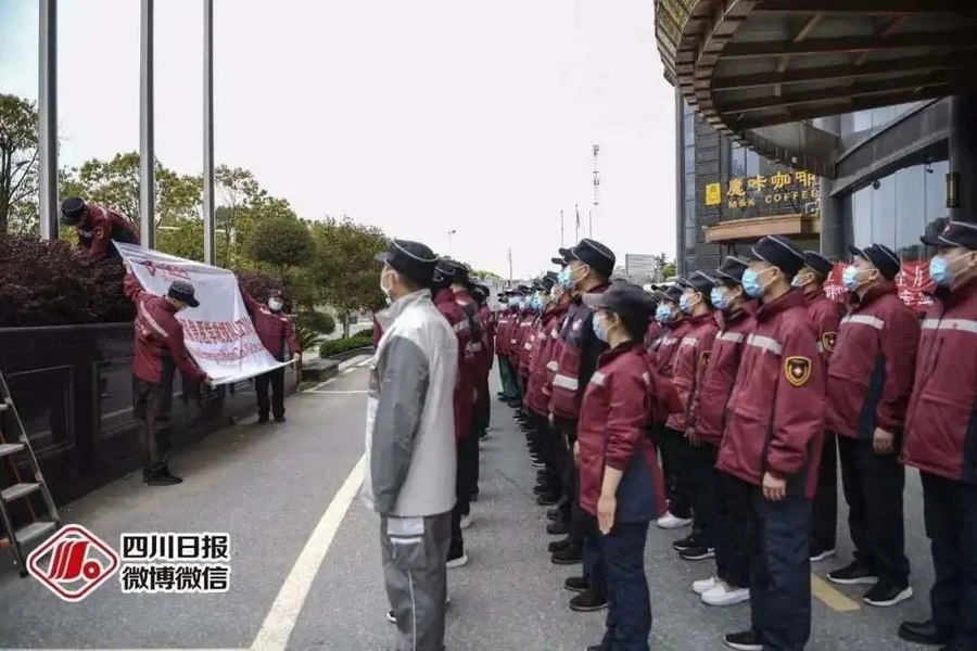 武汉汉阳区为首批离开的四川队颁发了一面锦旗,每个队员都收到了感谢信和鲜花。