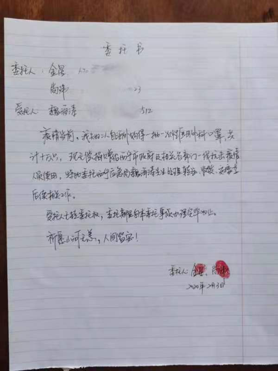但因全省抗疫物资太缺,尚玮捐赠的10万只医疗口罩(经对30箱口罩清点核实后,可能因俄罗斯那面发货有误,实际到货是92700只)中只能自己定向2000只,其余的都无偿捐赠给了西宁市政府和相关部门,由西宁市应急储备局负责转运、收货和交接,送往全省抗击疫情一线。自己定向的2000只,她通过社员王英分给所在平安镇人民政府600只、李晶的民和县孝康养老服务中心600只、由董银华分给格尔木市人民医院300只,王文祯分给平安区村委工作人员100只、李富善分给乐都区村委工作人员100只,省图书馆驻村书记所在东珠乡镇300只。