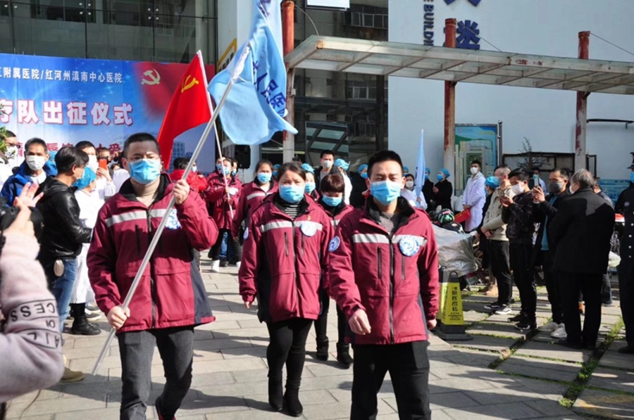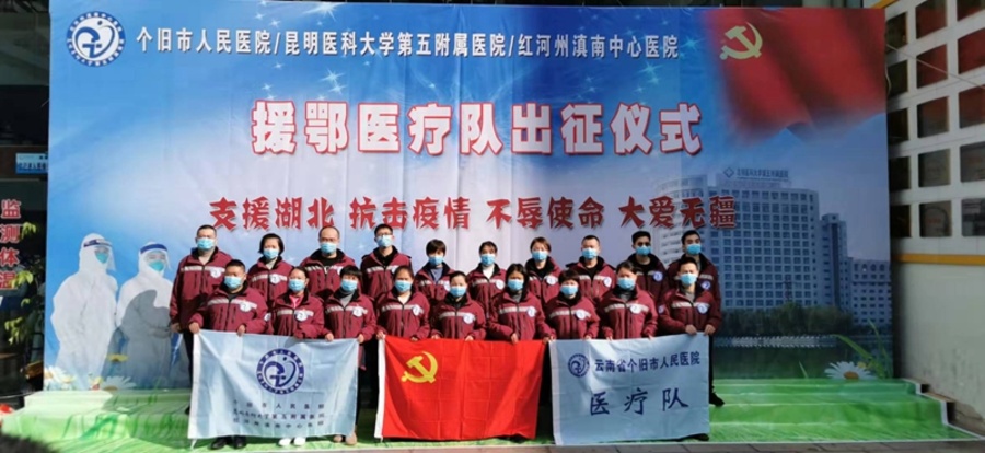 疫情当前,八方驰援!2月11日,个旧市人民医院赴湖北抗击疫情医疗队19名医务人员集结完毕、踏上征途。