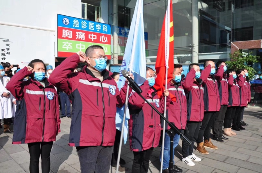 出征仪式现场,饶振译代表19名队员庄严宣誓:“支援湖北,抗击疫情,不辱使命,坚决完成医疗救援任务!”