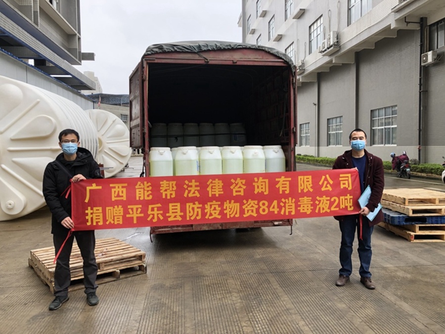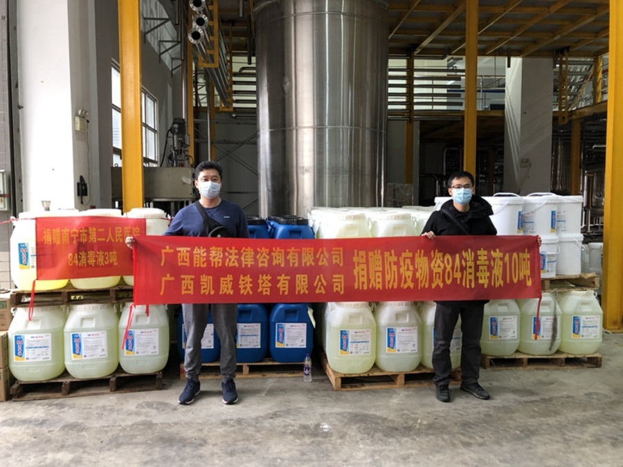 2月13日,九三学社南宁市法律工作委员会主任陈建财,九三学社社员、广西凯威铁塔有限公司董事长潘桂权共同出资7.7万元购买14吨消毒液,分别捐赠给南宁市第四人民医院、第二人民医院,邕宁区卫健局、邕宁区中医院、桂林市平乐县,以实际行动助力新冠肺炎疫情防控工作。