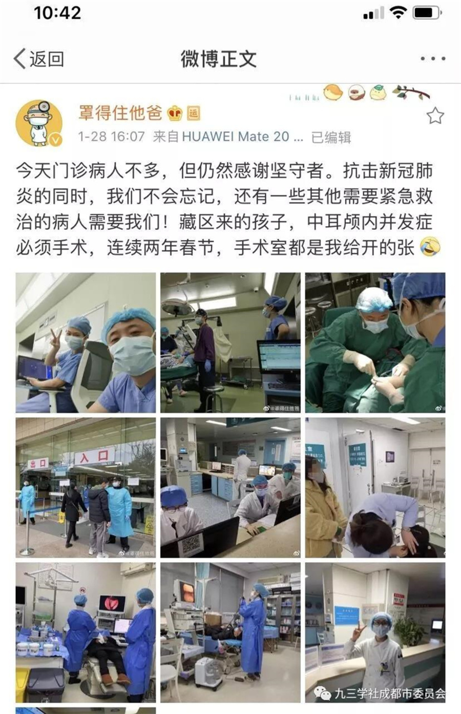 九三学社四川大学委员会副主委、九三学社成都市青年工作委员会主任、四川大学耳鼻喉头颈外科副主任赵宇----微博名“罩得住他爸”在1月28日微博中写到:“今天门诊病人不多,但仍然感谢坚守者。抗击新冠肺炎的同时,我们不会忘记,还有一些其他需要紧急救治的病人需要我们!藏区来的孩子,中耳颅内并发症必须手术,连续两年春节,手术室都是我给开的张。”还有许许多多的九三人,他们用勇敢与坚守,奉献与坚持,为生命站岗,为希望起航,向所有坚持在一线岗位上的白衣天使致敬。
