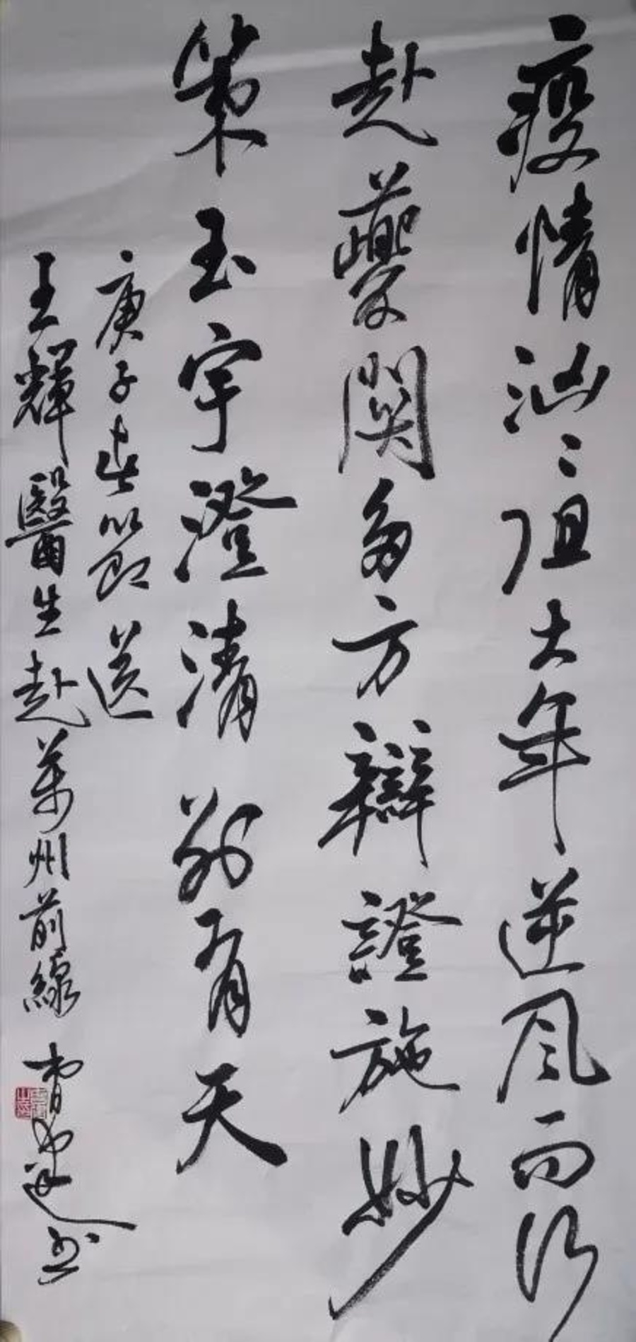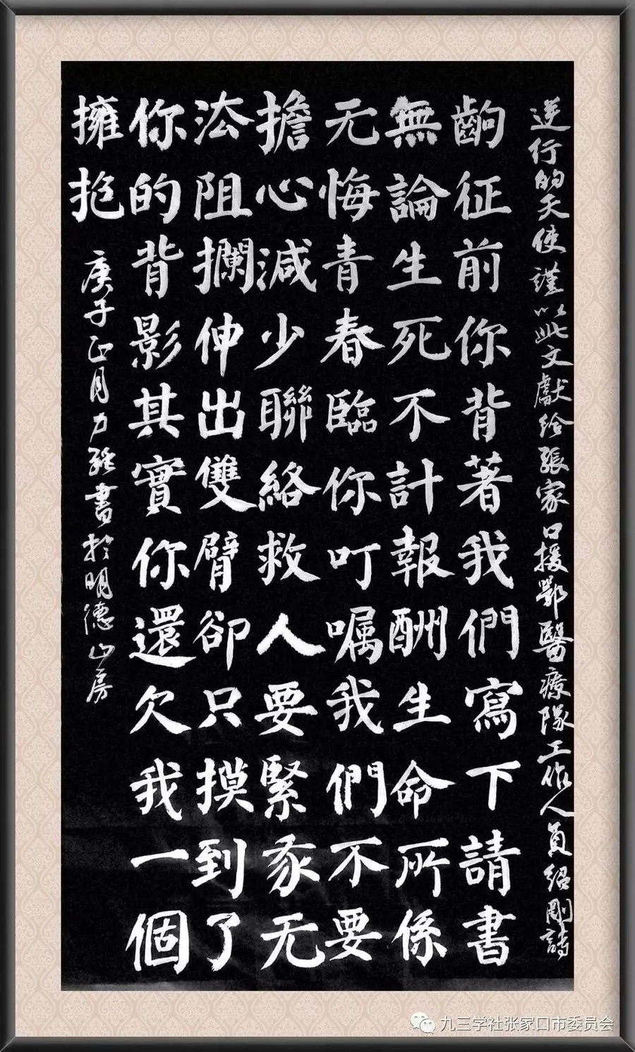 新冠肺炎疫情发生以来,九三学社社员中的文化工作者、文艺爱好者,感动于全国上下抗击新冠肺炎疫情所展现出的众志成城和医护人员的家国情怀,纷纷用绘画、书法、诗词、歌曲等形式,讴歌白衣战士,坚定必胜信念,凝聚人心力量。
