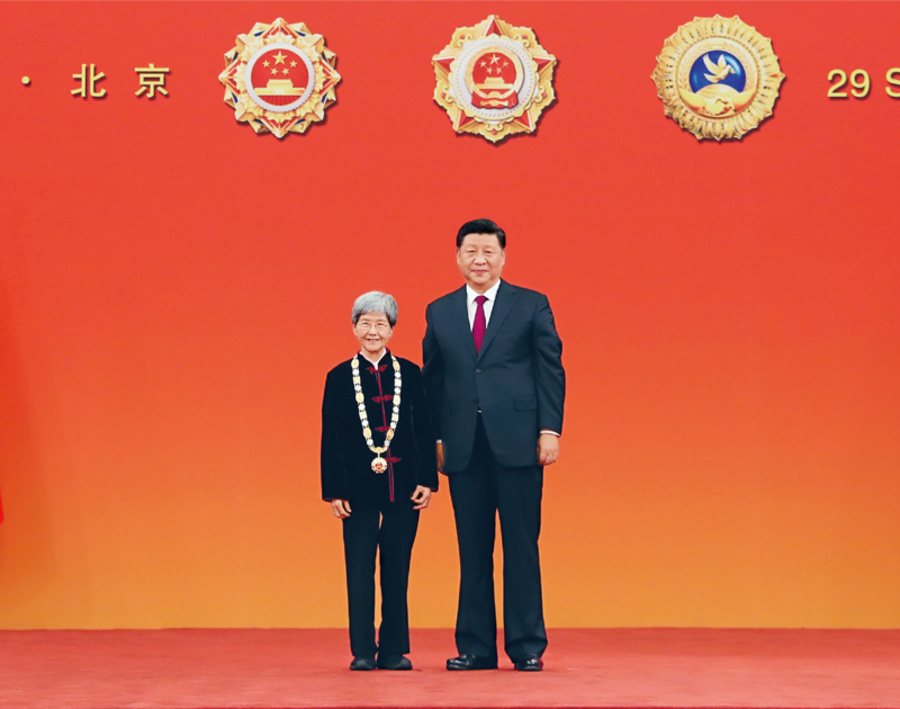 2019年9月29日,中华人民共和国国家勋章和国家荣誉称号颁授仪式在北京人民大会堂金色大厅隆重举行。中共中央总书记、国家主席、中央军委主席习近平向“文物保护杰出贡献者”国家荣誉称号获得者樊锦诗颁授奖章。 新华社记者 王晔/摄