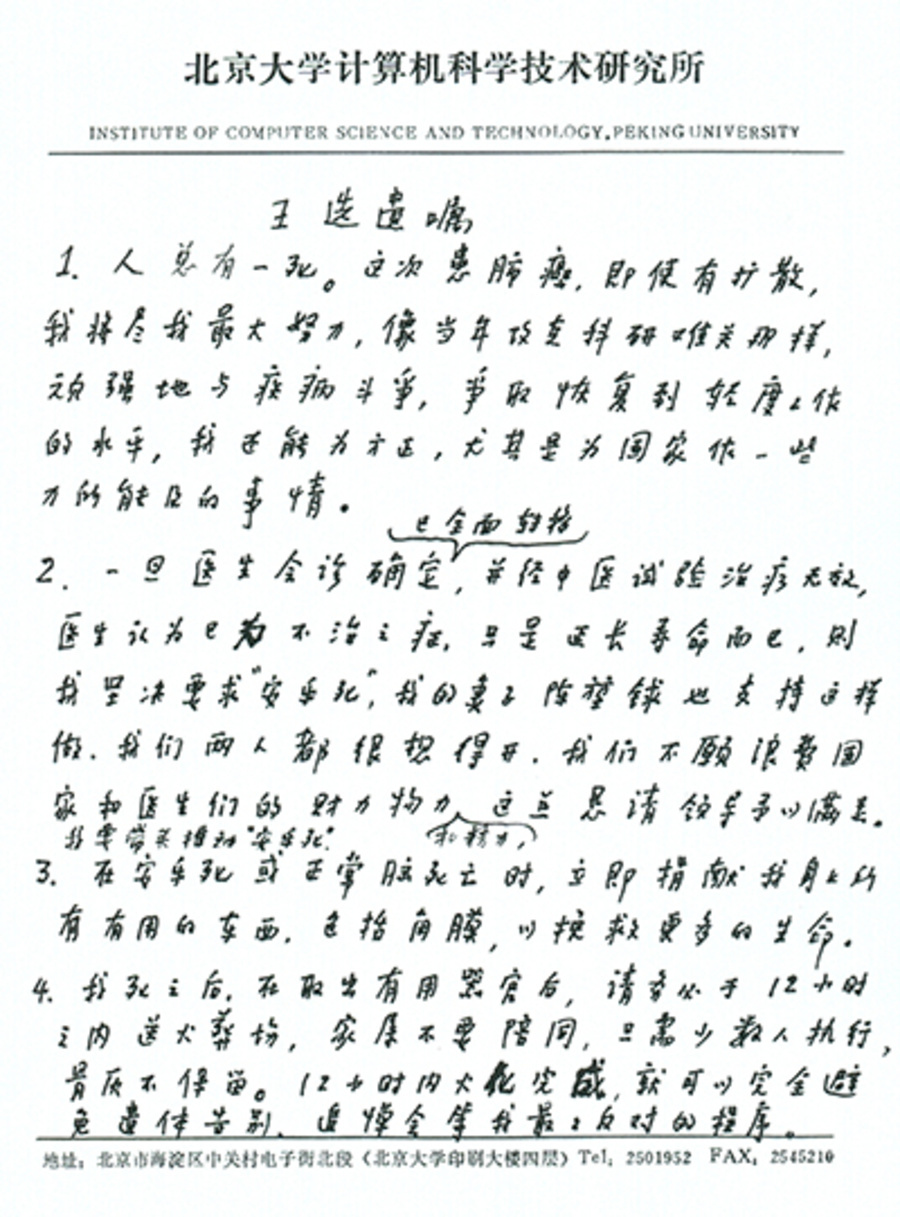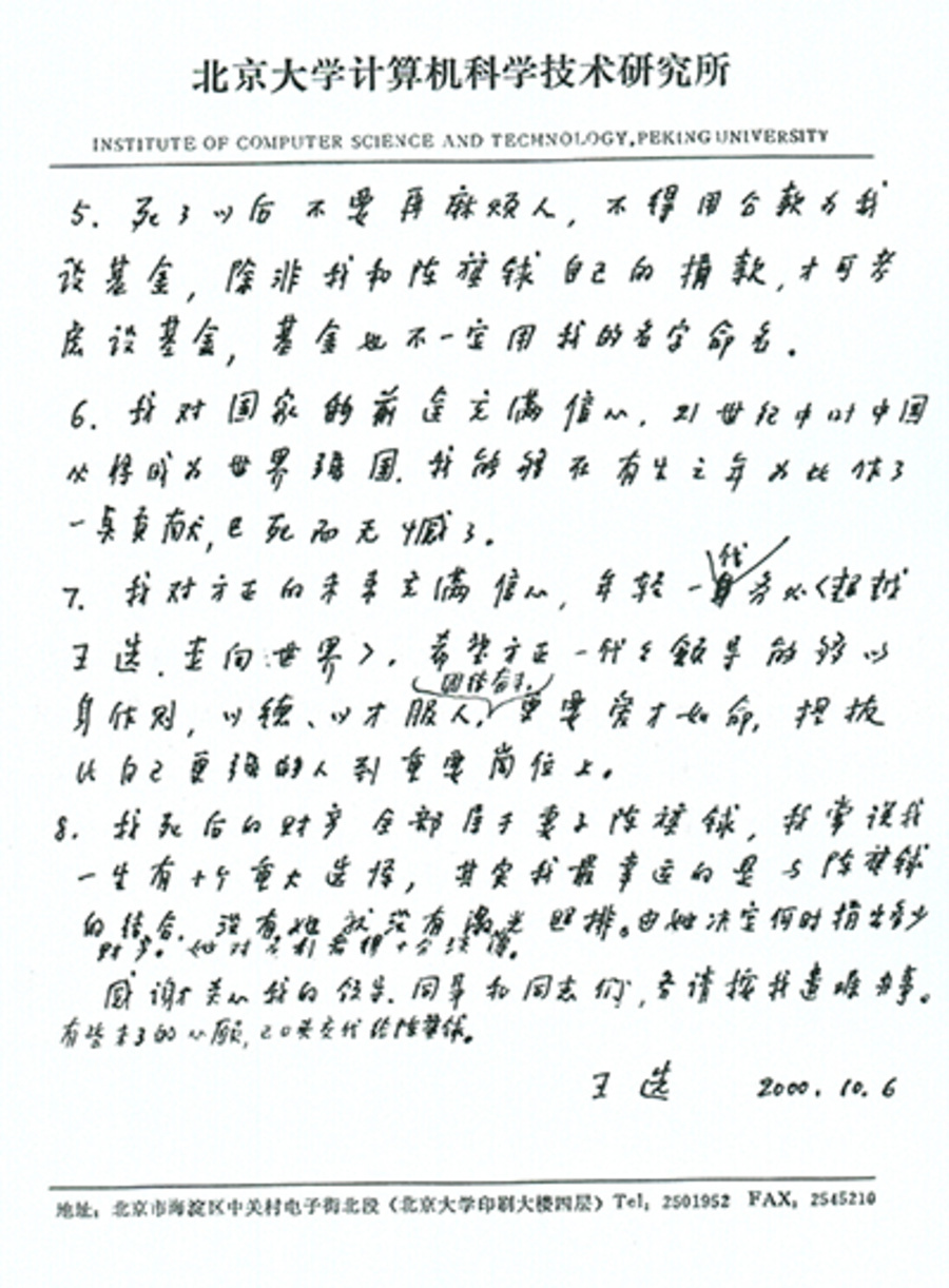 “1.人总有一死。这次患肺癌,即使有扩散,我将尽我最大努力,向当年攻克科研难关那样,顽强地与疾病斗争,争取恢复到轻度工作的水平,我还能为方正,尤其是为国家作一些力所能及的事情。2.一旦医生会诊确定已全面转移,并经中医试验治疗无效,医生认为已为不治之症,只是延长寿命而已,则我坚决要求‘安乐死’,我的妻子陈堃銶也支持这样做。我们两人都很想的开,我们不愿浪费国家和医生们的财力物力和精力,这点恳请领导予以满足。3.我要带头推动‘安乐死’,在‘安乐死’或正常脑死亡时,立即捐献我身上所有有用的东西,包括角膜,以挽救更多的生命。4.我死之后,在取出有用器官后,请务必于12小时之内送火葬场,家属不要陪同,只需少数人执行,骨灰不保留。12小时内火化完成,就可以完全避免遗体告别、追悼会等我最最反对的程序。5.死了以后不要再麻烦人,不得用公款为我设基金,除非我和陈堃銶自己的捐款,才可考虑设基金,基金也不一定要用我的名字命名。6.我对国家的前途充满信心,21世纪中叶中国必将成为世界强国,我能够在有生之年为此做出一点贡献,已死而无憾了。7.我对方正的未来充满信心,年轻的一代务必超越王选,走向世界。希望方正一代代领导能够以身作则,以德、以才服人,团结奋斗,更要爱才如命,提拔比自己更强的人到重要岗位上。8.我死后的财产全部属于妻子陈堃銶。我常说我一生有十个重大选择,其实我最幸运的是与陈堃銶结合,没有她就没有激光照排。由她决定何时捐出多少财产。她对名利看得非常淡薄。感谢关心我的领导、同事和同志们,务请按我遗嘱办事,有些未了的心愿,已口头交代给陈堃銶。”