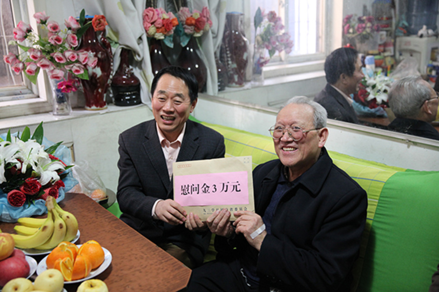 2014年1月21日,河南郑州。春节前夕,阵阵寒风挡不住心里浓浓暖意,九三学社河南省委主委张亚忠专程来到连文星家中,送上王选关怀基金资助款3万元,并祝他早日康复。犹如雪中送炭,连文星哽咽了,他反复地说着谢谢。在感谢信里,他这样写到,“沉沦之际,面对深彻的关怀和及时支持,我感同获救,看到了希望,犹如灿烂阳光照入心房,颓废的雾霾被一扫而净。”