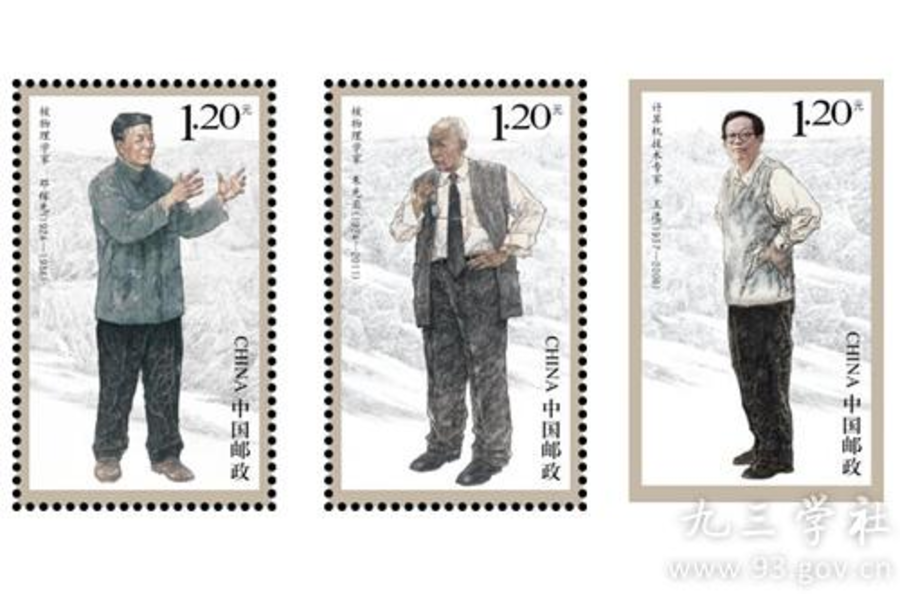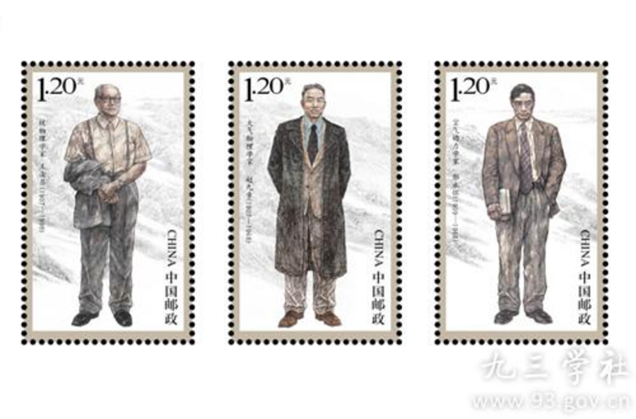 中国邮政于2014年10月16日发行《中国现代科学家(六)》纪念邮票1套6枚,邮票内容分别为王淦昌、赵九章、郭永怀、邓稼先、朱光亚、王选6位中国现代科学家。邮票采用国画的形式,笔触开阔,色墨结合,形神俱佳地描绘了六位科学家的形象。画面中,人物形象生动自然,仿佛在研究思考、在讨论问题,真实地还原了他们的工作状态和科研精神。其中,王淦昌、赵九章、邓稼先、王选4人为九三学社社员。