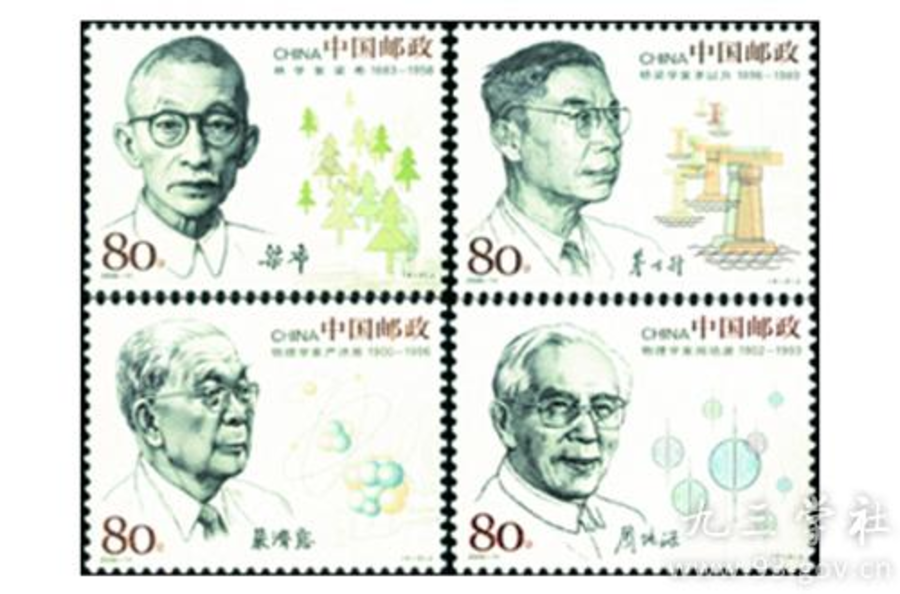 《中国现代科学家》邮票自1988年发行以来,至今已连续发行了六组,除了第六组的四位九三人以外,2006年发行的第四组邮票所载四位科学家——梁希、茅以升、严济慈、周培源均为九三人。梁希(1883-1958),浙江吴兴人,九三学社创始人之一,林学家、林业教育家。新中国林业的奠基人、领导者,绿化祖国的积极倡导者。茅以升(1896-1989),江苏镇江人,桥梁学家、教育家,中国近代桥梁事业的先驱,中国土力学的开拓者。严济慈(1901-1996),浙江东阳人,物理学家,中国现代物理学研究的创始人之一,中国光学研究和光学仪器研制工件的奠基人之一。周培源(1902-1993),江苏宜兴人,理论物理学家、流体力学家,湍流模式理论的奠基人。
