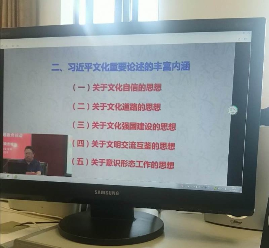 此次学习邀请到中央党校文史部教授、博导,中央党校创新工程首席专家、国家社科基金重大项目首席专家范玉刚博士,围绕《习近平新时代中国特色社会主义思想的文化解读》进行授课。课堂上,范玉刚博士通过“习近平文化重要论述的语境与问题意识”和“习近平文化重要论述的丰富内涵”两大部分九条要点,结合近期习近平总书记考察甘肃时有关文化的重要讲话以及古今中外文化理论思想,尤其是当前所处的社会环境、意识形态,进一步阐述习近平总书记对文化建设的重要指导意见。
