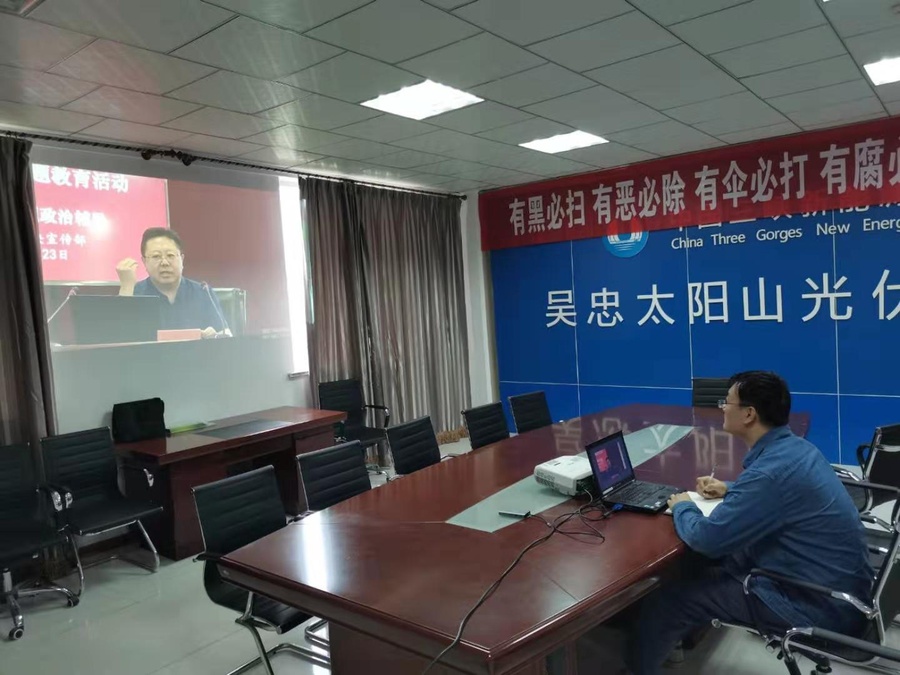 在宁夏,九三学社社员、三峡新能源吴忠发电有限公司吴忠太阳山光伏电站工程师蔡杰通过“网络课堂”参加主题教育活动政治辅导。