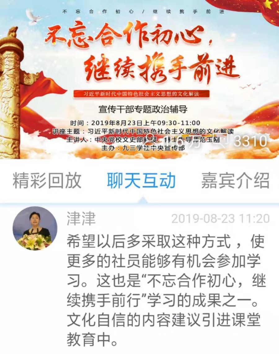 九三学社举办“不忘合作初心,继续携手前进”主题教育活动宣传干部第一期专题政治辅导