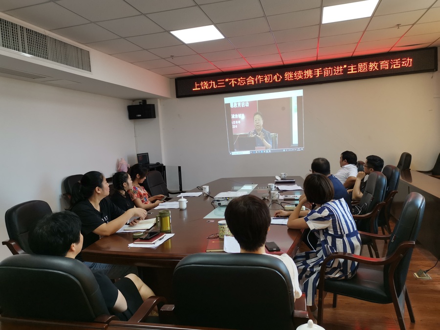 8月23日上午,九三学社上饶市工委组织机关干部和部分社员在机关会议室收看“不忘合作初心 继续携手前进”主题教育专题政治辅导。市人大常委会副主任、九三学社上饶市工委主委祝美清主持活动。