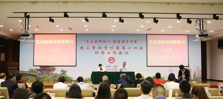 为深入开展“不忘合作初心,继续携手前进”主题教育活动,将学习教育贯穿活动全过程,9月19日,九三学社贵州省委在贵阳孔学堂举办主题教育活动暨“九三讲坛”专题讲座,特邀贵州省文化和旅游厅副厅长、九三学社贵州省委副主委汪文学做《文化自信与民族复兴》专题讲座。九三学社贵州省委主委黄宗洪、副主委郑国旗出席,秘书长李梓主持。