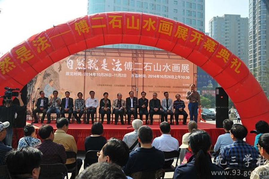 由江苏省国画院、南京博物院、九三学社江苏省委、九三学社中央书画院、文化部国韵文华书画院联合主办的 “自然就是法——傅二石山水画展”,于10月26日上午九三学社江苏画院开幕。江苏省政协主席张连珍,中共江苏省委统战部副部长周和平,江苏省教育厅副厅长、九三学社江苏省委副主委杨湘宁,江苏省中华文化促进会常务副会长兼秘书长高以俭,海外中国美术家协会主席、江苏省政协常委、香港美协创会主席萧晖荣,江苏省国画院院长周京新,原南京书画院院长朱道平,江苏省国画院副院长、著名画家薛亮,江苏省文化发展基金会秘书长柯江,九三学社江苏画院院长陆越子,江苏知何堂艺术品投资有限公司董事长周峰等人出席了开幕式。
