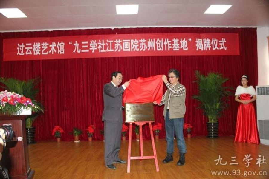 “九三学社江苏画院苏州创作基地”由九三学社和过云楼云楼艺术馆共同发起,旨在推广传统文化、普及传统书画艺术。江苏省人大常委会副主任、江苏省九三学社主委许仲梓先生、九三学社江苏画院院长陆越子共同进行揭牌,“九三学社江苏画院苏州创作基地”落户于苏州,这对于苏州市的传统书画创作和研究,将是一个重要的提升。今后,九三学社江苏画院与过云楼云楼艺术馆将陆续邀请国内知名画院及书画艺术家,举办各种中国书画、传统文化等美术教育活动,以推广传统文化、普及传统书画艺术为己任,使创作基地真正成为一座“沟通民众和传统文化”的桥梁。