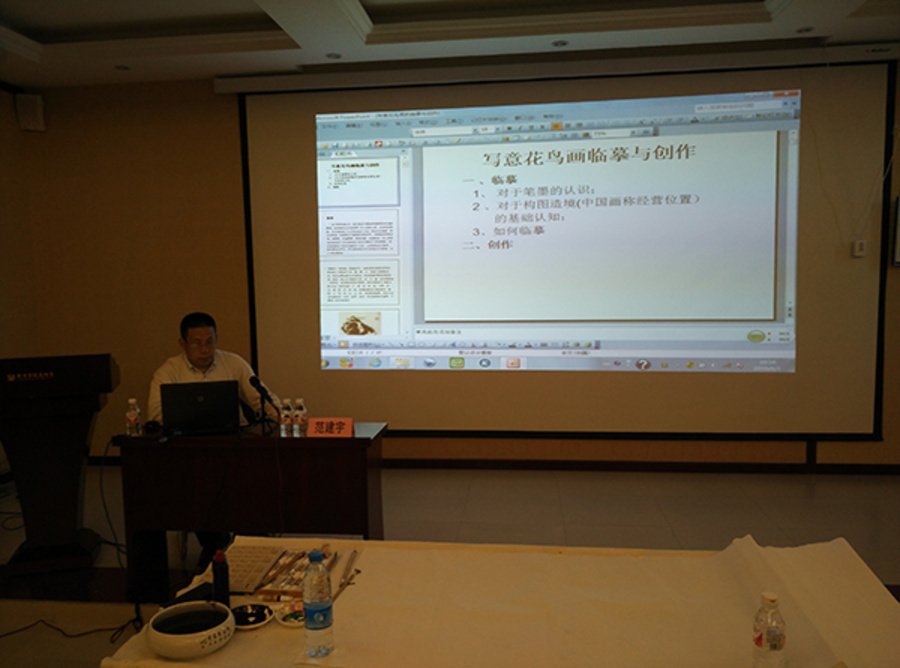 洪亮从“书法形式美十一大法则”开始讲解,如传统书法的“均匀之美”、“开合之美”、“对称之美”、“参差之美”等。从中国三千年的书法文化典故到现代造型设计原理,讲解了书法的字法之美。王贵华的山水画写生与创作,为听者展开的是一幅幅画面生动、线条流畅,亦如诗文,独有的艺术放言,传递对山水的内心感语。范建宇的写意花鸟画的临摹与创作,不仅博引了中国传统大师们的经验与方法,同时与自身相结合,向大学生们充分讲解了花鸟画如何临摹与创作,博得了同学们的热烈掌声。